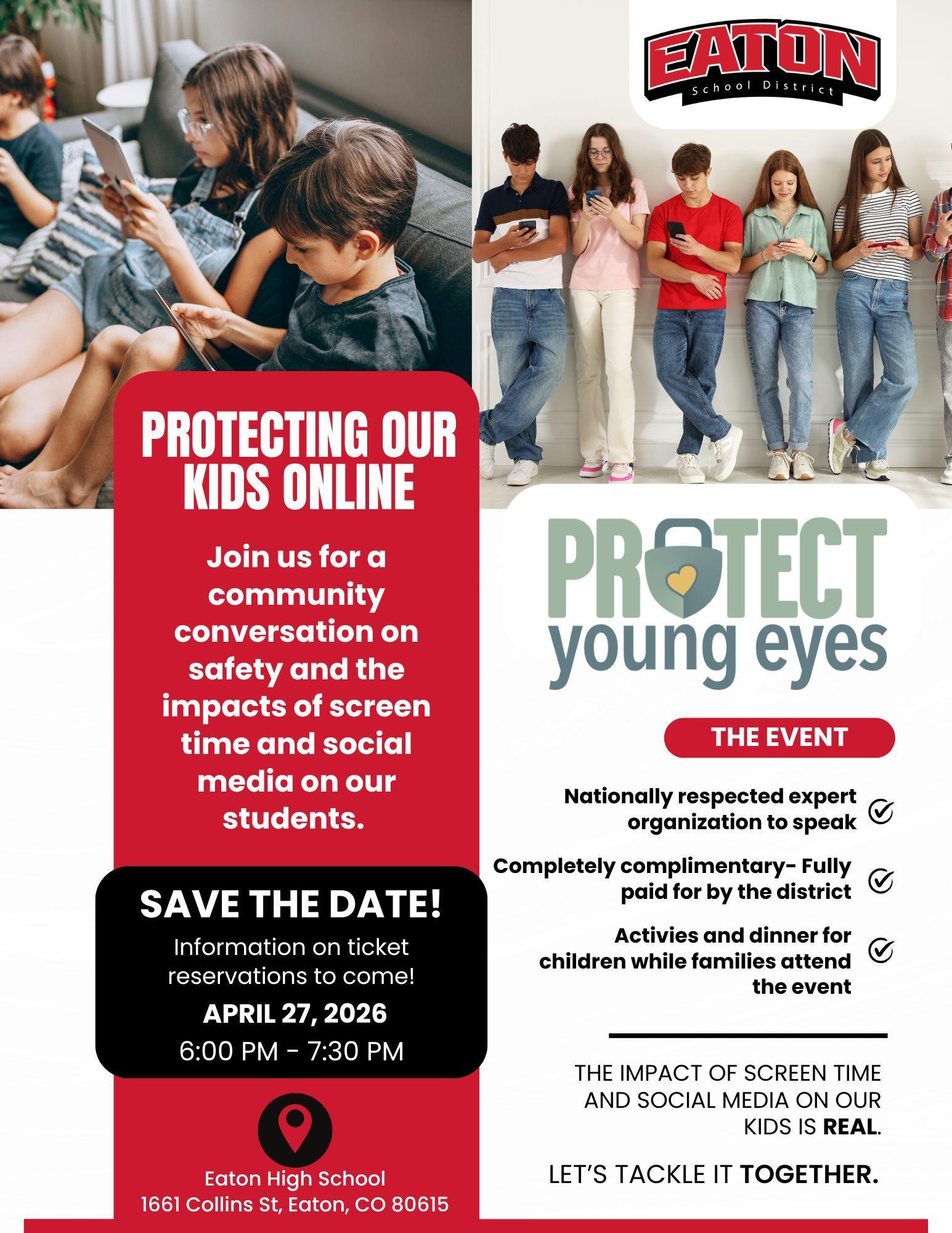 That’s why Eaton School District is partnering with Protect Young Eyes to host the event, completely complimentary and fully paid for by the district, on April 27th from 6:00PM–7:30 PM at Eaton High School. Join us for an important conversation on how we can better support and protect our kids online. Childcare, dinner, and a raffle prize are included, but space is limited. Stay tuned as more information is to come on how to reserve your spot and help spread the word!
